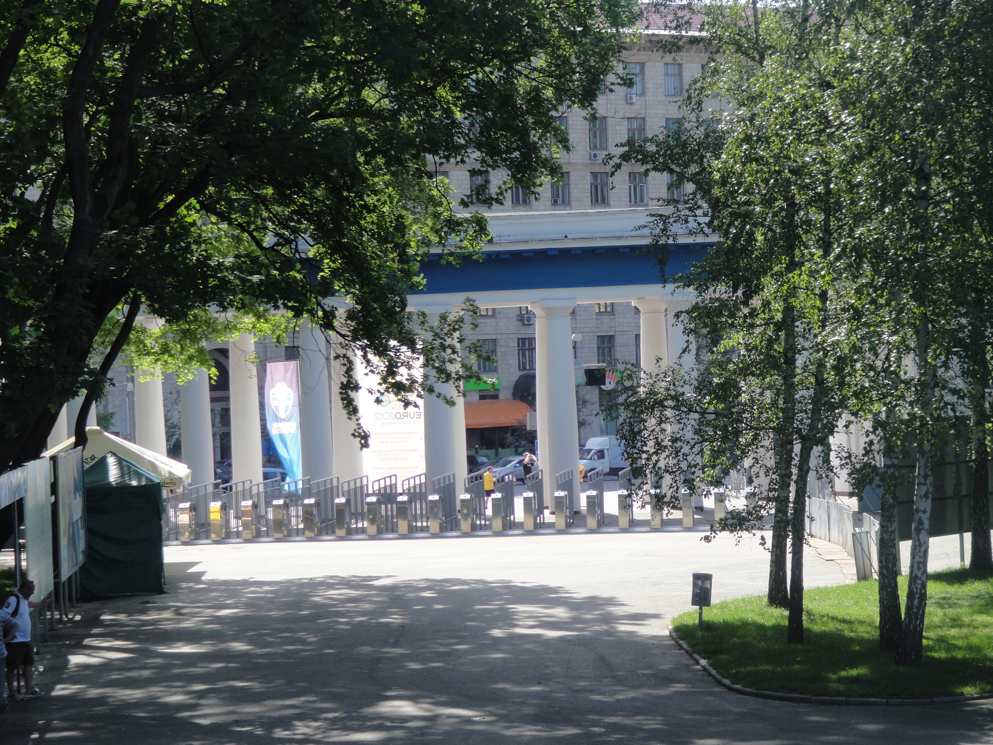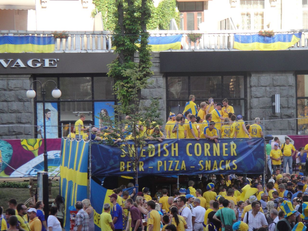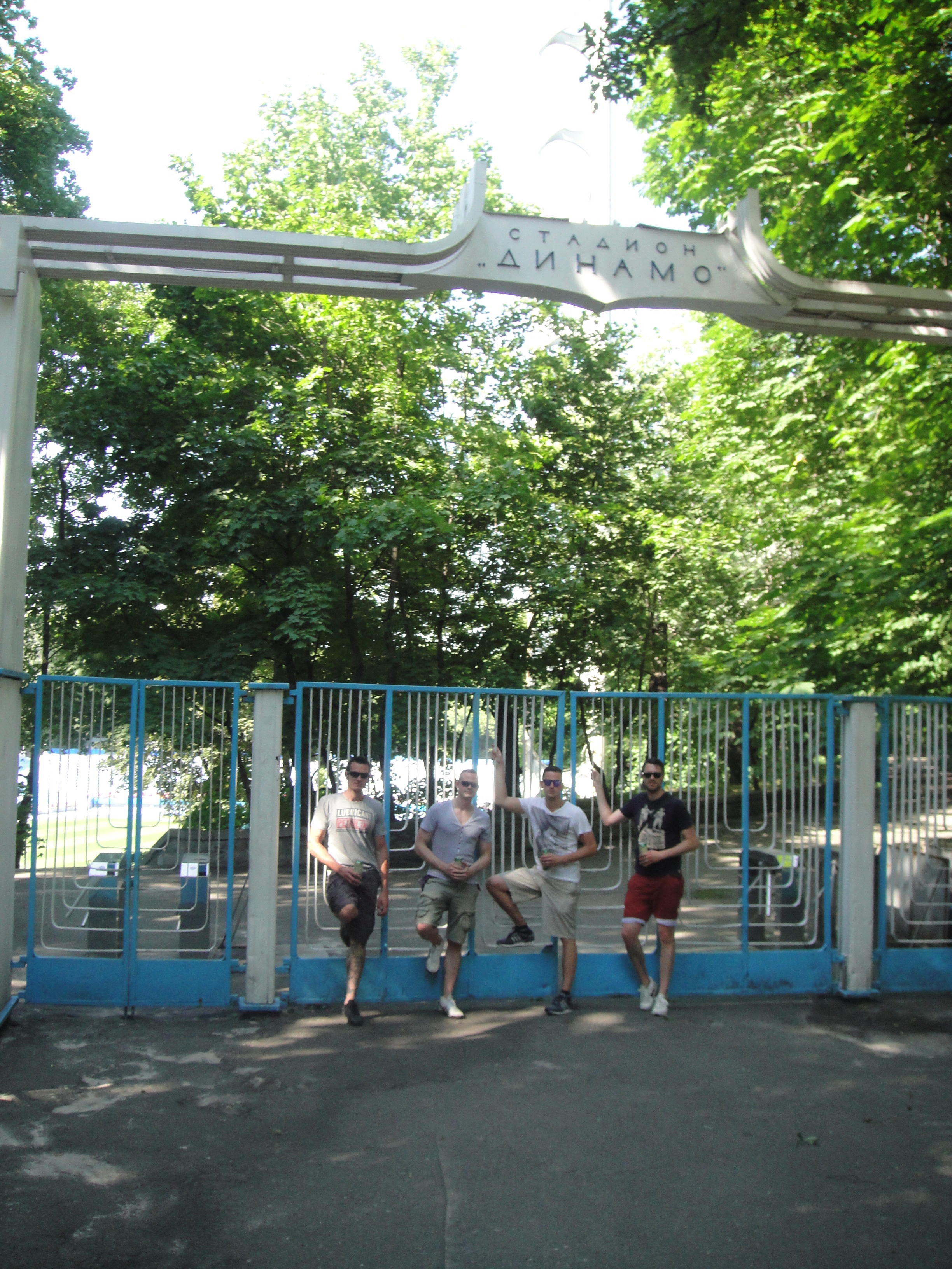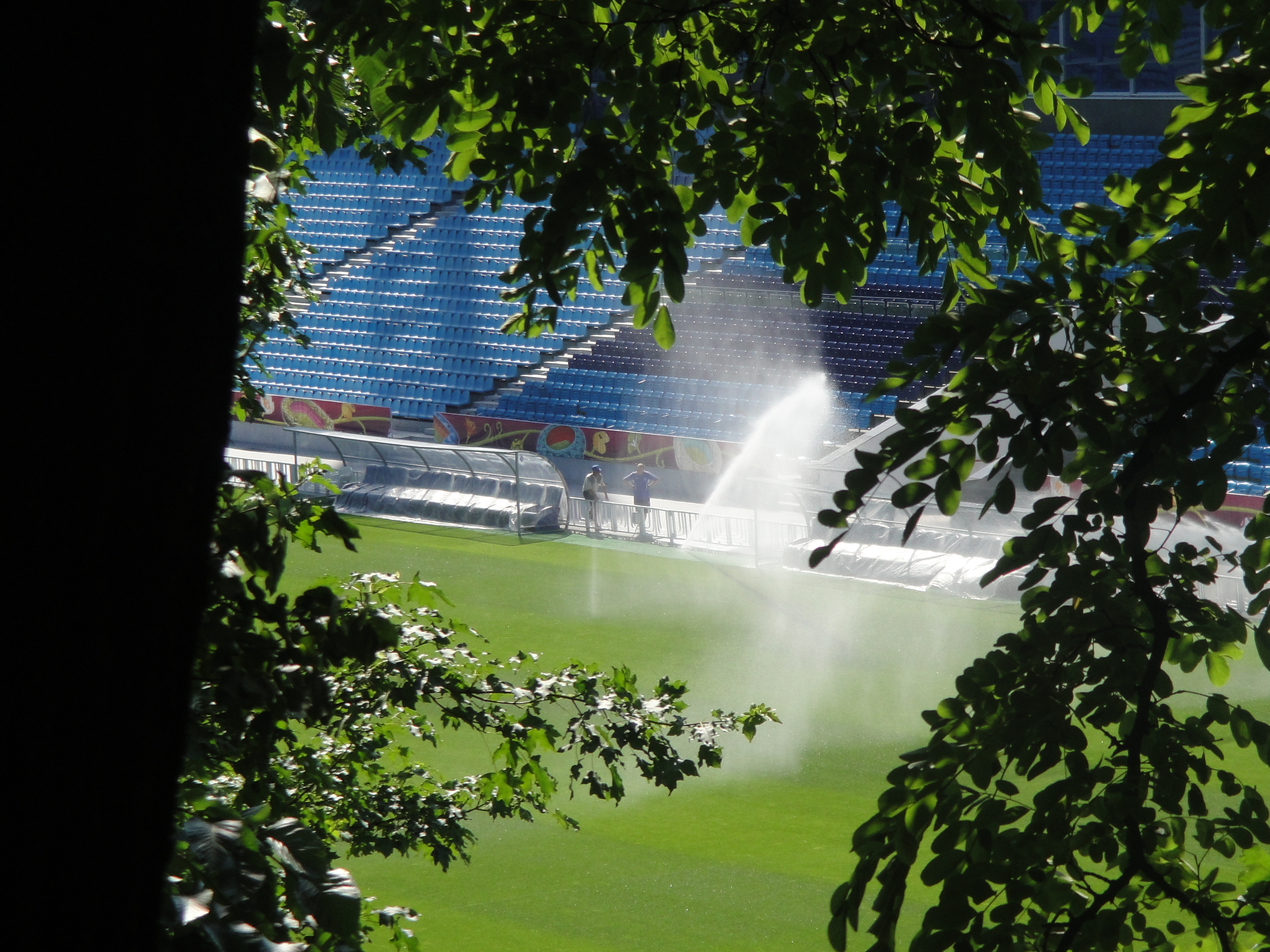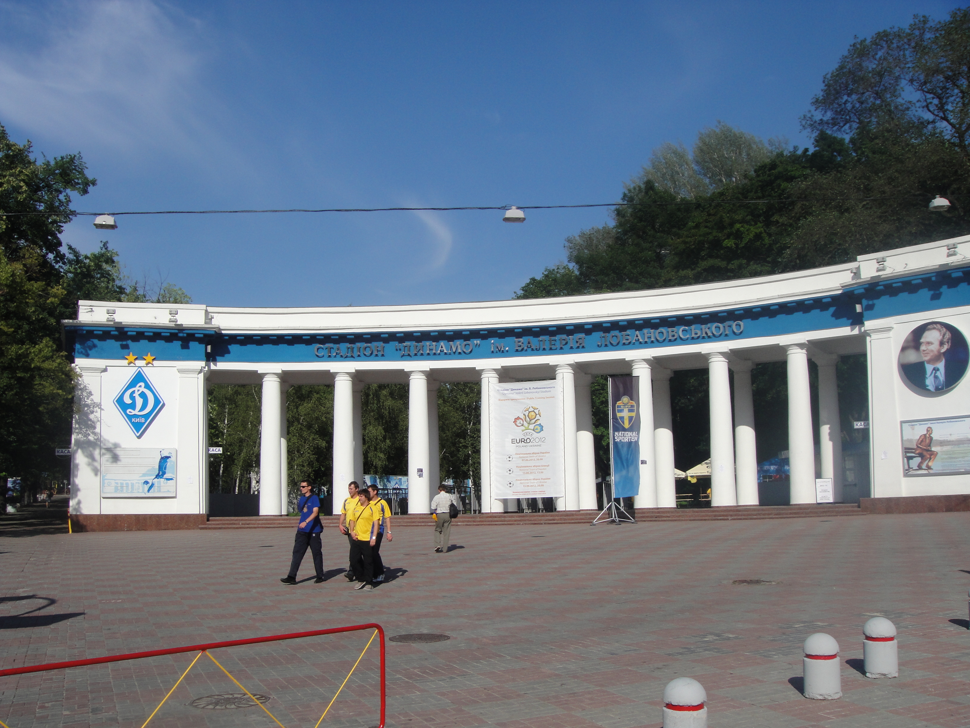 Kiew selbst ist eine Metropole, in der zurzeit der blau-gelbe Wahnsinn ausgebrochen ist. Die Ukraine hat das Spiel gegen die Schweden gewonnen und während die Fans aus dem Norden mit steinernen Mienen durch die Straßen in Richtung ihres Camps zogen, kannte Kiew kein Halten mehr. Die ganze Stadt war auf den Beinen und hat bis in den Morgengrauen gefeiert - und wir mitten drinnen. Vorher haben wir aber noch ein wenig Sightseeing betrieben und das Stadion von Dynamo Kiew besucht, das in einem Park gelegen ist. Leider durften wir die Tribünen nicht betreten, weshalb es nur ein paar Schnappschüsse aus der Entfernung gibt. Dasselbe gilt für das Olympiastadion, das wir beim ersten Halt leider auch nicht von innen gesehen haben. Tickets für das Eröffnungsspiel waren auf dem Schwarzmarkt einfach zu teuer.